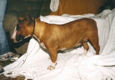 | Plemeno: | bulteriér | Barva srsti: | červená, bílé znaky, krátká |
