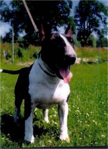 | BONA z Kaiserovy farmy bulteriér, bílá se znakem/znaky | APOLO z Černovické hájovny bulteriér, černá s žíháním, bílé znaky | |