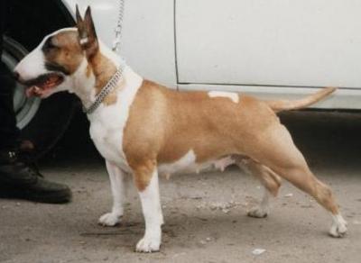 Plemeno: bulteriér Barva srsti: červená, bílé znaky, krátká