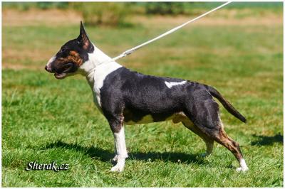 | Plemeno: | miniaturní bulteriér | Barva srsti: | černá s žíháním, bílé znaky, krátká |