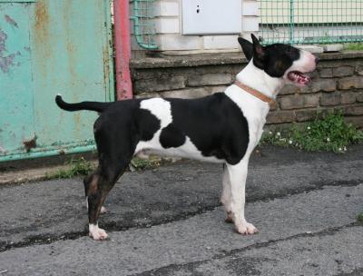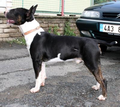 | Plemeno: | bulteriér | Barva srsti: | černá s žíháním, bílé znaky, krátká |