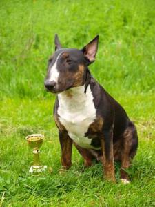 | BERTILLE Lestell bulteriér, černá s žíháním, bílé znaky | QUENTIN Pajar bulteriér, bílá | Llanwenarth's LOVE HURTS bulteriér, bílá se znakem/znaky |