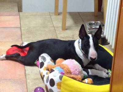 | Plemeno: | bulteriér | Barva srsti: | černá s žíháním, bílé znaky, krátká |
