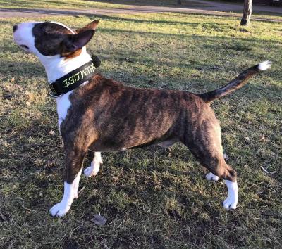 | Plemeno: | miniaturní bulteriér | Barva srsti: | žíhaná, bílé znaky, krátká |