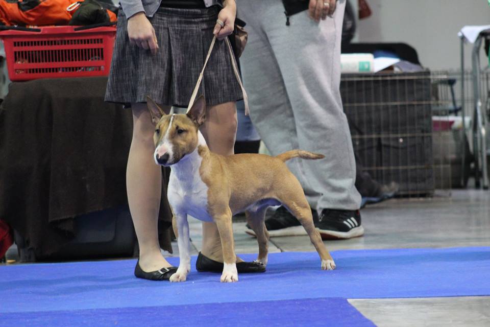 | Bullcreeks BUSY BEING FABULOUS miniaturní bulteriér, bílá se znakem/znaky | Eywas GLACIER BUTTERCUP miniaturní bulteriér, červená, bílé znaky | Bisbull's VERY HOT DOG miniaturní bulteriér, červená, bílé znaky, 36.5 cm |