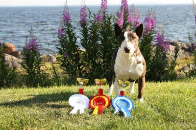 | Justeph MATHEWS MAIDEN miniaturní bulteriér | Justeph SUPRISE ENCOUNTER miniaturní bulteriér, plavá, bílé znaky | Camenna PIMMS OF JUSTEPH miniaturní bulteriér, plavá, bílé znaky |