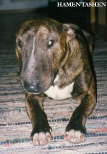 | GARRONE Hamentashen | fena | bulteriér | žíhaná, bílé znaky |