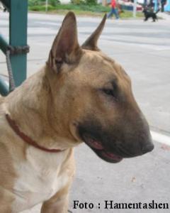 | Plemeno: | bulteriér | Barva srsti: | červená, bílé znaky, krátká |