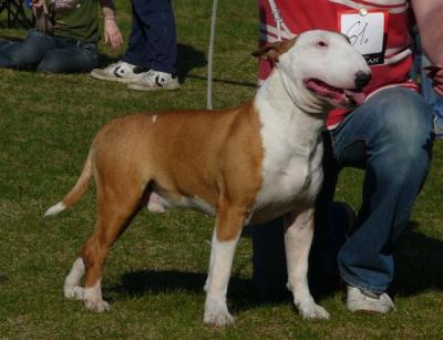 | Gimar LADY HAWK OVER Llanwenarth bulteriér, žíhaná, bílé znaky | Apache BRAVE of Kilacabar bulteriér, bílá se znakem/znaky | |