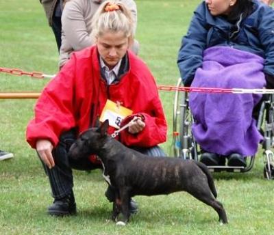 | Plemeno: | miniaturní bulteriér | Barva srsti: | žíhaná, bílé znaky, krátká |